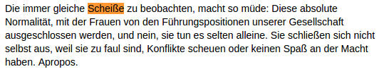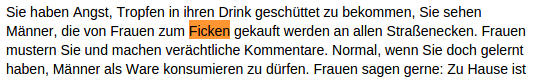 Gut, die Einleitung war etwas liebestrunken. Nüchtern betrachtet ist ihr Artikel platter feministischer Murks, der ganz im „Kackscheiße-Stil“ nicht ohne Kraftausdrücke auskommt. Allerdings kommt sie mit nur zweimal „Scheiße“ und einmal „Ficken“ im ganzen Artikel aus.