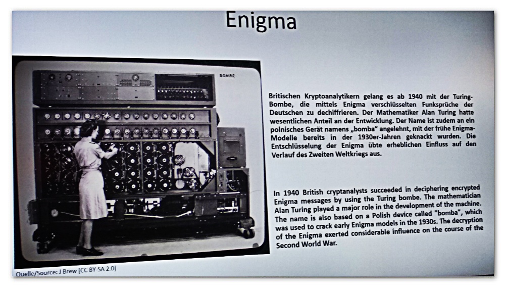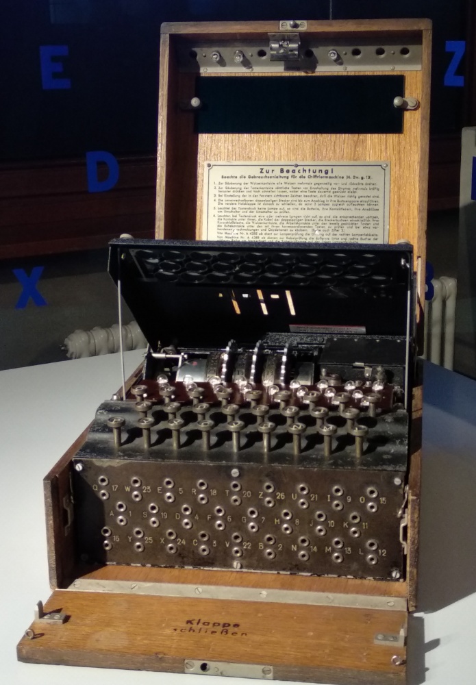 Die Wehrmacht setzte während des Zweiten Weltkrieges die Enigma zur Verschlüsselung des Nachrichtenverkehrs ein. Polizei, Geheimdienste, Reichspost, SS und sogar die Reichsbahn setze die Maschine ebenfalls ein. Im Museum ist sie zu sehen.