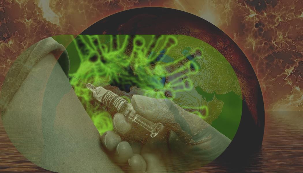 Die brennende Welt, darüber ein Arm, der gerade eine Impfdosis erhält