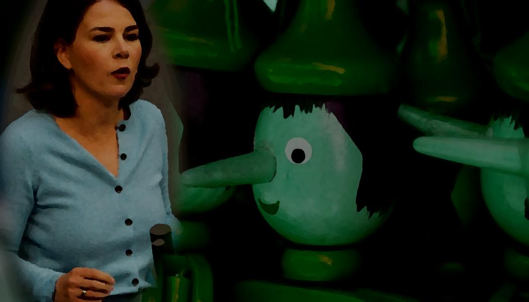 Die Bundeskanzlerkandidatin Annalene Baerbock. Dahinter einige Pinnocchios.